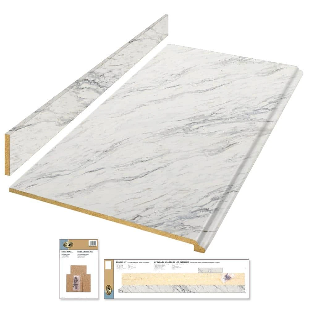 - Kit includes one 8 ft. laminate countertop in Calcutta Marble with Valencia edge, one 3 in. loose backsplash, 1 endcap kit, and 1 build-up kit