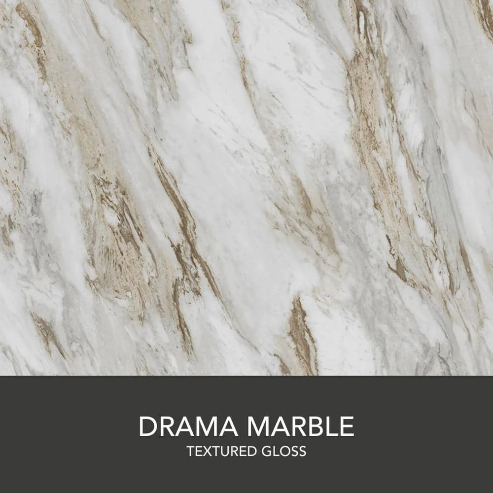 - Drama marble is a striking laminate with a white marble design featuring vivid grey, brown, and bronze veining