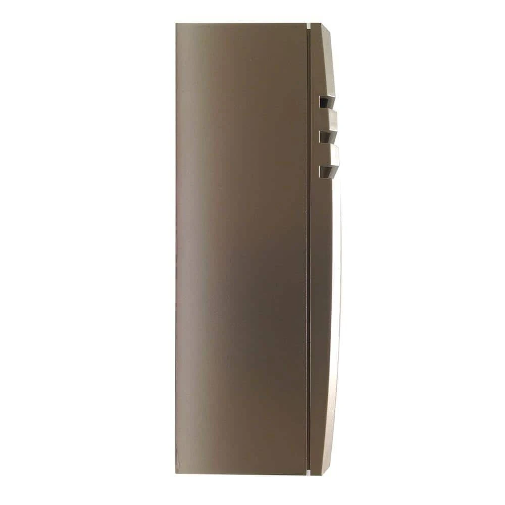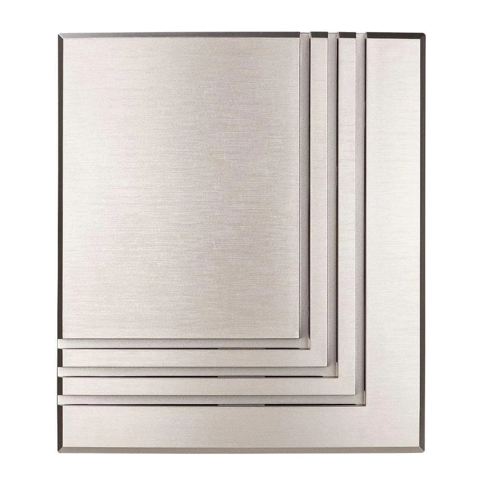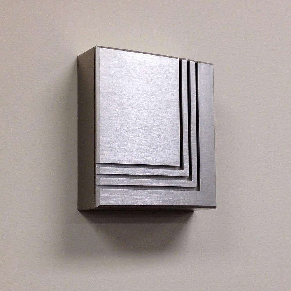 - Contemporary styled doorbell cover with a brushed nickel finish