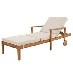 Hampton Bay Willow Glen Farmhouse Wood Outdoor Patio Chaise Lounge with Wheels and Beige Cushions